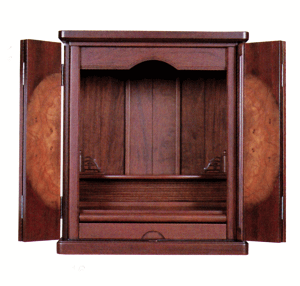 国産品の上置仏壇です。サイズ:高さ 49.1cm×幅 39.9cm×奥行 30.5cm。材質 杢種 :黒檀、紫檀。塗装:ウレタン仕上げ5分消し。本体総重量:約8kg。生産国:日本。