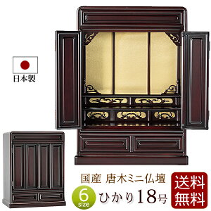 仏壇 唐木仏壇 ライト18号 紫檀調 黒檀調 上置き仏壇。18号 高55×幅44×奥40cm。材質は紫檀調・黒檀調。コンパクトでいながら高級感が漂うお仏壇です。全国・全宗派で祀られております。
