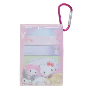 ケースとしてもつかえて便利文房具/メッセージ/伝言/学校/オフィス大人気サンリオキャラクターズのキュートなステーショナリーシリーズこちらは携帯しやすくて便利な[カラビナポーチ付き付箋]4種類のかわいい付箋が各15枚セットになって