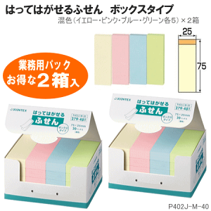 商品名 はってはがせるメモ・ふせん のりつきメモ 混色 ボックスタイプ 2箱 品番 P432J-M-40 サイズ メモ:縦75×横25mm、箱(1箱):幅105mm×奥行き80mm×高さ56mm、 仕様 入数:100枚×40パッド 、...
