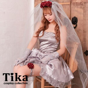 ITEMくすみカラーでホラーテイストを演出したホラーテイストウェディングコスチューム。純白の花嫁ならぬホラーゾンビ花嫁デザインが他と被りにくく、ミニ丈が愛らしい雰囲気に◎SET ITEMワンピース / フットアクセ手袋 / ベールカチューシ