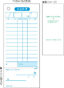 単式伝票です。■ 基本仕様複写枚数単式サイズ(縦x横)153x75mm行数12ページ数100ミシン目なし通しNo.なしテーブルNo.あり名様・人様あり担当者・係ありおあいそ票なし品名入りなし紙色白刷色紺