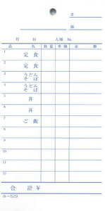 うどん店向け品名が入っており使いやすい単式伝票です。■ 基本仕様複写枚数単式サイズ(縦x横)xmm行数12ページ数100ミシン目なし通しNo.なしテーブルNo.あり名様・人様あり担当者・係ありおあいそ票なし品名入りあり紙色白刷色青