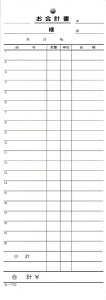 20行の単式伝票です。行数が多くて、品名欄が広く取っています。コース料理の多いお店で使われます。細かなコース内容の変更に対応できます。仲居さんが客席と厨房を行き来する時に使う伝票です。■ 基本仕様複写枚数単式サイズ(縦x横)2