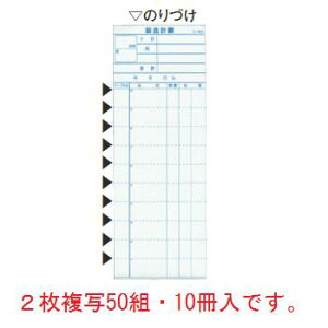 伝票 会計表 2P50組・10冊入です。 【外寸】85×190mm ■複写多状ミシン目入り伝票 お客さまのオーダーが一度で決まらず追加オーダーが多い場合や厨房と客席が 離れている場合に使用します。<br