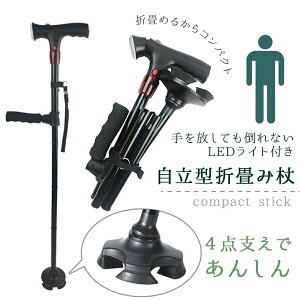 商品紹介compact stick自立型折畳み杖4点支えで安心、手を放しても倒れないLEDライト付き【立つ時にも座る時にも便利な2ハンドル】片手で杖を支えに、立ったり座ったりするのは不安だけど、2つのハンドルがあるから両手が使えてとっ...