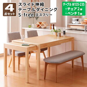 画像はシリーズ・バリエーション等も掲載している場合がございます。お間違いのない様ご購入下さい。こちらは4点セット(テーブル+チェア×2+ベンチ×1)の販売ページです。商品名スライド伸縮テーブルダイニング S-free エスフリー 4点