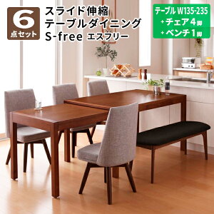 画像はシリーズ・バリエーション等も掲載している場合がございます。お間違いのない様ご購入下さい。こちらは6点セット(テーブル+チェア×4+ベンチ×1)の販売ページです。商品名スライド伸縮テーブルダイニング S-free エスフリー 6点