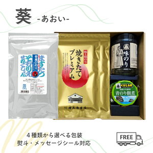 葵 ーあおいー ご飯好きに喜ばれる、ちょうどいい贈り物。 当店の看板商品、極上焼海苔焼きたてプレミアムと 通ならご存じの青混ぜの原料の独特の青のりの香りと風味が味わえる稀少品、青飛びのりプレミアム。 異なる2種類の極上焼海