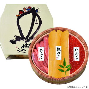 内容/北海道産いくら醤油味/100g、塩たらこ(アメリカ又はロシア産)・味付け数の子(カナダ又はアメリカ産)/各120g 箱サイズ/250×240×60mm 木樽・化粧箱 重量/850g アレルゲン/小麦・えび・いくら・さば・大豆 賞...