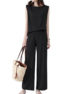 【夏の着痩せ神セット】ノースリーブ×ゆったりパンツの2点セットウエストゴムで体型カバー!涼感素材のノースリーブトップと、落ち感抜群のシンプルパンツで、暑い日も快適通勤?無地デザインで上品に着回しOK洗練されたシルエットが夏