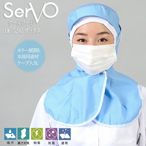 サーヴォ クールフード(ホワイト) DC5182 本体は接触冷感素材、額にパイル素材を使用し、落髪・ズレ防止と汗止め効果があります。 頬・首部分は吸汗・速乾ニット素材。ツバとマスク掛けは織芯で洗濯可能、立体ケープで肩の負担を軽減。<br