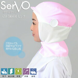 サーヴォ クールフード(ピンク) DC5012 本体は接触冷感素材、額にパイル素材を使用し、落髪・ズレ防止と汗止め効果があります。 頬・首部分は吸汗・速乾ニット素材。ツバとマスク掛けは織芯で洗濯可能、立体ケープで肩の負担を軽減。