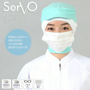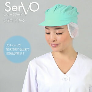 サーヴォ ショートフード(グリーン) DC5217 本体は接触冷感素材、ツバは洗濯耐久性の高い織芯を使用。 額と頬はパイル素材で落髪・ズレ防止と汗止めの効果を発揮します。 耳は通気性と通音性に優れたメッシュ。前留めと後頭周りはマジックテ