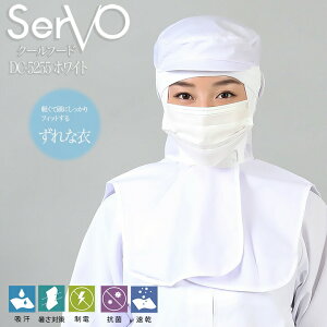 サーヴォ クールフード(ホワイト) DC5011 本体は接触冷感素材、額と頬に吸汗速乾ニットを使用し落髪・ズレ防止と汗止め効果あります。 ツバとマスク掛けは織芯で洗濯可能、肩に立体ケープ。首はスナップボタン調整式、前方メガネ差し部分には