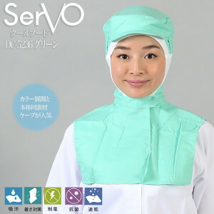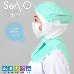 サーヴォ クールフード(グリーン) DC5213 本体は接触冷感素材、額にパイル素材を使用し、落髪・ズレ防止と汗止め効果があります。 頬・首部分は吸汗・速乾ニット素材。ツバとマスク掛けは織芯で洗濯可能、立体ケープで肩の負担を軽減。