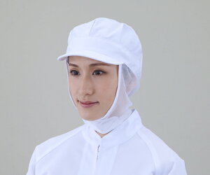 フード(ホワイト) RN6920 ツバは耐洗濯性の高い織芯、頬、首はニット素材で落髪・ズレを防止。 立体ケープで動きやすさも考慮しています。前部の留めはマジックテープで調整可能。 メガネ差しはスリット式、後頭周り調整はゴム入りで、
