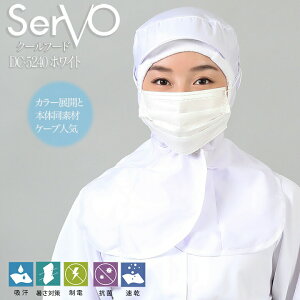 サーヴォ クールフード(ホワイト) DC5183 本体は接触冷感素材、ツバは洗濯耐久性の高い織芯を使用。 額と頬はパイル素材、落髪・ズレ防止と汗止めの効果あり。耳部とケープは通気性の優れたメッシュ。 前部留め、後頭周りはマジックテ
