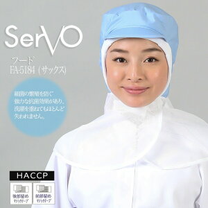 フード(サックス) FA5184 ツバは洗濯耐久性の高い織芯を使用。額と頬はパイル素材、落髪・ズレ防止と汗止めの効果あり。 耳部とケープは通気性の優れたメッシュ。前部留めと後頭周りはマジックテープでサイズ調整可能です。 交差汚染に