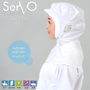 サーヴォ クールフード(ホワイト) DC5011 本体は接触冷感素材、額と頬に吸汗速乾ニットを使用し落髪・ズレ防止と汗止め効果あります。 ツバとマスク掛けは織芯で洗濯可能、肩に立体ケープ。首はスナップボタン調整式、前方メガネ差し部