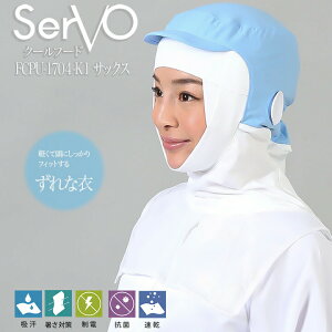 クールフード(被りタイプ)サックス FCPU-1704-K1 ツバは耐洗濯性の高い織芯。顔周りはニット素材で肌に優しく、異物落下防止します。 首後は吸汗速乾性の高いテクノファイン(R)、立体ケープは通気性と放熱性の高い快適なメッシュ素材。