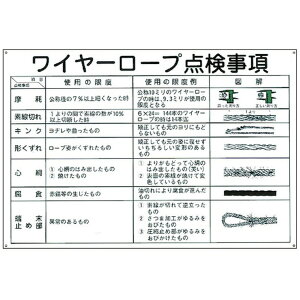 クレーン作業に関する安全標識です。 ワイヤーロープの点検事項が図解された樹脂製標識です。 用途 当該情報の明示に。 表印刷 穴径:φ4mm×4ヵ所 表示内容:ワイヤーロープ点検事項 取付仕様:穴4ヵ所...