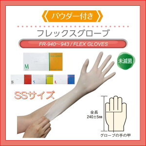 未滅菌ラテックスグローブ 型式:FR−940(SS)、941(S),942(M),943(L) 商品名:フレックスグローブ 枚数:1箱 100枚入り 材質:天然ゴム 特長:指にフィットする天然ゴム製未滅菌パウダー付手袋です。 薄手仕上...