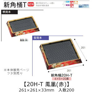 商品名 新角桶20H-T 鳳凰(赤) 商品コード 0752339 外寸・深さ(mm) 261×261×33 ケース入数 200枚 袋入数 10枚 素材 HIPS(ポリスチレン) メーカー 福助工業株式会社 販売者 株式会社梶本 〜握り...
