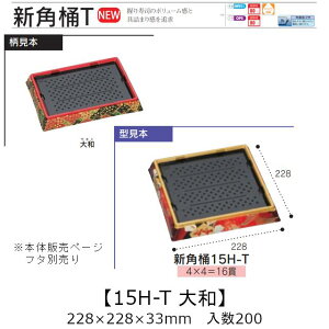 商品名 新角桶15H-T 大和 商品コード 0752827 外寸・深さ(mm) 228×228×33 ケース入数 200枚 袋入数 10枚 素材 HIPS(ポリスチレン) メーカー 福助工業株式会社 販売者 株式会社梶本 〜握り寿司の...