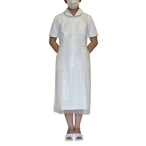 ポリエチレン素材のため、防水性があり血液、体液等を通さず感染リスクの軽減が図れます。まとわりつきにくいエンボス加工を施しています。頭からかぶるデザインで、腰ひもはうしろ結びです。サイズ:前中心丈92cm、身巾71cm材質:ポリ