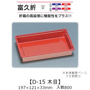 商品名 富久折 D-15 木目 商品コード 0593923 外寸・深さ(mm) 197×121×33 ケース入数 800枚 袋入数 50枚 素材 HIPS(ポリスチレン) メーカー 福助工業株式会社 販売者 株式会社梶本 〜折箱の高級...