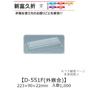 商品名 新富久折 D-551F(外嵌合) 商品コード 0730165 外寸・深さ(mm) 223×90×22 ケース入数 1,000枚 袋入数 50枚 素材 OPS(二軸延伸ポリスチレン) メーカー 福助工業株式会社 販売者 株式会社...