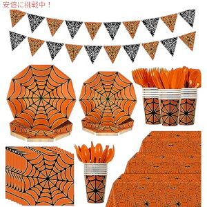 2個 x ペナントバナー 24個 x ディナープレート 24個 x デザートプレート 24個 x 紙コップ 24個 x 紙ナプキン 24個 x スプーン 24個 x 24個 x フォーク 3個 x オレンジブラックスパイダーウェブプリ...