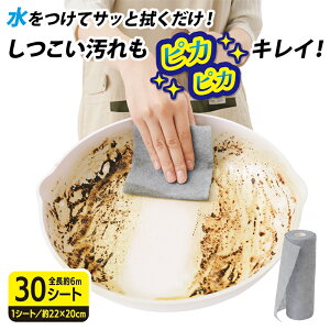 薄手で丈夫!研磨剤不使用。表面の凸凹構造が汚れをスッキリ削り取る!水をつけるだけで頑固な汚れまでスッキリキレイ!便利なカットライン付き!1ロールあたり30シート(全長約6m)