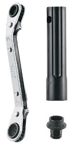納期目安:お取り寄せ品(詳しくはこちらをクリック)●洋便器のタンクや便座の取付用ラチェット機構付レンチ。 ●ボルトナット対辺10・13(アダプター使用時12)用