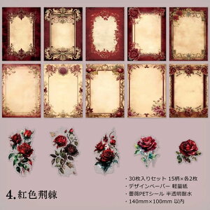 アンティーク調コラージュ素材セットです! ⇒ 花柄 PETシール、半透明、耐水、ラージサイズ ⇒ デザインペーパー、背景紙、メモパッド 落ち着い