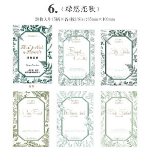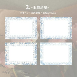内 容:62枚/冊、31柄×各2枚 素 材:2種類紙質、クラフト紙+書写紙 サイズ:63mm×40mm