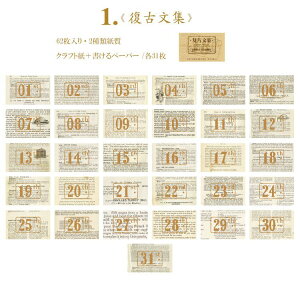 ◆平日16時迄のお支払いは当日出荷(土日祝を除く)。 海外 アンティーク調の日付チケット風素材紙セット 英語と数字があわせたデザインがおしゃれ! たっぷり62枚入り、異なる2種類紙質が楽しめます ミニブックタイプ、バラにならず、収納