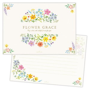 手書きのお手紙で気持ちを届けようかわいい/おしゃれ/文房具/メッセージ/ギフト定番人気の花柄レターを、横位置のレイアウトで新鮮な印象に。金箔加工を施したタイトルと、その周りに咲くように描かれた色とりどりのお花が目を引くエレ