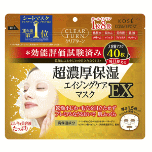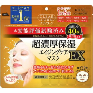 クリアターン 超濃厚保湿マスク EX 40枚入 プレミアムなうるおいを届ける1枚8役の高保湿エイジングケア※マスク。 コクのあるミルキィ美容液が角層奥まで巡り、肌のバリア機能をサポート。 毛穴が目立ち...