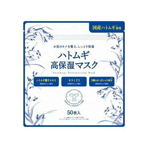 ハトムギ高保湿マスク 内容量 50枚。成分 水、グリセリン、DPG、エタノール、セラミド3、ハトムギ種子エキス、ダイズ種子エキス、カンゾウ根エキス、プルーン分解物、イチョウ葉エキス、ソメイヨシノ葉エキス...
