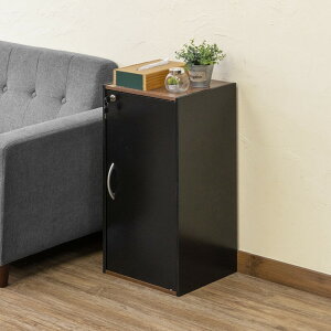 木目柄と無地のツートンカラーに仕上げた鍵付シェルフ。鍵付きなので、自分専用の収納スペースを確保。扉内の棚板は可動棚で、3cmずつ17段階の高さに付け替えて使うことができます。棚板は2枚付属。扉はマグネットでピタッと閉まります