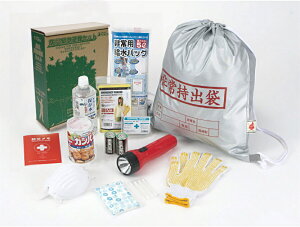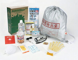 非常時持出袋(日本防災協会認定品)。LEDラジオライト(単4電池3本付)。綿棒4本・ポケットティッシュ。保存飲料(500ml)。缶入りカンパン(100g)×2。非常用給水バッグ5L。サバイバルシート。すべり止め付軍手。ポンチョ。ダスト...