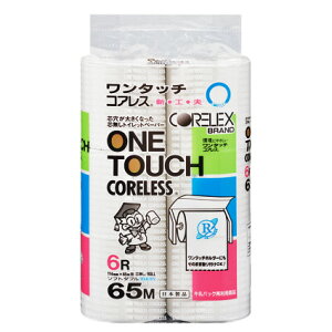ワンタッチコアレス65m 6ロール ダブル(10パック入) 取り替えカンタンな太芯タイプ。たっぷり使える65m。ゴミの出ない芯無しロール。エコで環境にやさしい再生紙100%。ギザギザ穴だから、最後まで剥がれやすく、つぶれにくい仕様 ■仕様: