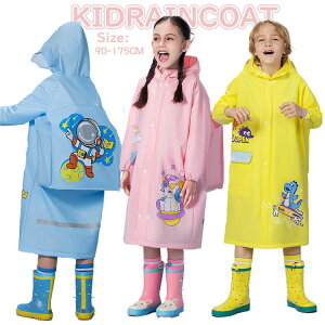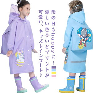 ・雨の日もhappyに!優しい色合いとプリントが可愛い、キッズレインコート♪・フードの広い範囲がクリア素材で作られているから、視界をさえぎらない♪・後ろ身頃に充分なタックを入れた、ゆったりとした作り。リュックやランドセルを