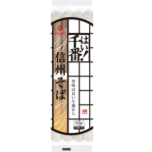 蕎麦粉5割使用。信州の黒い太切り藪蕎麦はしっかりとした噛み応え滑らかな口当たり、そばの風味の三拍子をお楽しみください。 鴨そばや肉そばの濃い味付けにも負けず流行りの太麺を、より太くした商品です。 原材料名:そば粉(国内製