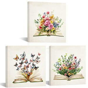 花と蝶の三連画です。絵の中央には開かれた本が描かれており、ページの上を蝶が優雅に舞っています。もう一幅の絵では、本のページから色鮮やかな花が咲き誇り、自然の生き生きとした美しさを表現しています。写実と抽象が融合し、本