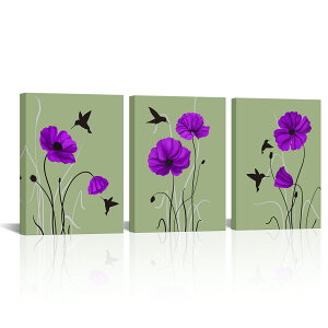 この装飾画は3枚組のパネルで構成され、それぞれに花卉と鳥をモチーフにしたデザインが施されています。シンプルで洗練された作風が特徴で、淡い背景色に映える花々のふくよかなシルエットと、鳥のシルエットが動的なアクセントを添え