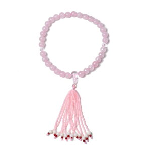 研磨作業にこだわった水晶を使用しております。糸を通す穴部分の磨き上げが十分に出来ており、通す糸の負担を軽減しています。 ポイントに配したローズクォーツが優しい印象を与えます。房部分に使用している宇治川房は、絹製で数本銀糸を織り交ぜた...