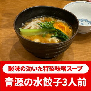 青源オリジナルの餃子にマッチする酸味のある特製味噌スープです。最後の一滴までお召し上がりいただける、青源だけの唯一の水餃子。